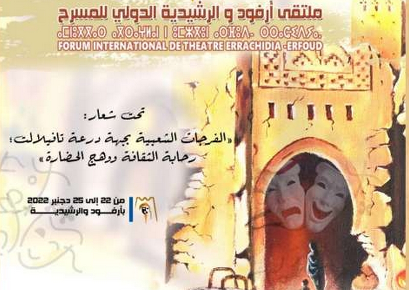 تحت شعار: “الفرجات الشعبية بجهة درعة تافيلالت، رحابة الثقافة ووهج الحضارة”، وبدعم من مجلس جهة درعة تافيلالت، تـنظم جمعية المشعل للمسرح والسينما بأرفود ومنتدى تافيلالت للمسرح والسينما والفنون الدرامية بالرشيدية: ملتقى أرفود والرشيدية الدولي للمسرح الدورة التاسعة – مشتركة – خلال الفترة الممتدة من 22 إلى 25 دجنبر المقبل، بكل من أرفود والرشيدية.