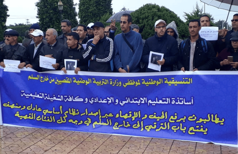 دعت التنسيقية الوطنية لموظفي وزارة التربية الوطنية المقصيين من خارج السلم، التابعة للجامعة الوطنية للتعليم – التوجه الديمقراطي، لاضراب وطني يومي الأربعاء والخميس 26 و27 أبريل 2023 مصحوب بوقفة أمام وزارة التربية ومسيرة نحو البرلمان يوم 26 أبريل 2023، مع المشاركة بكثافة في الوقفتين أمام المديريات و/أو الأكاديميات الأحد 26 مارس 2023 والأحد 9 أبريل 2023.