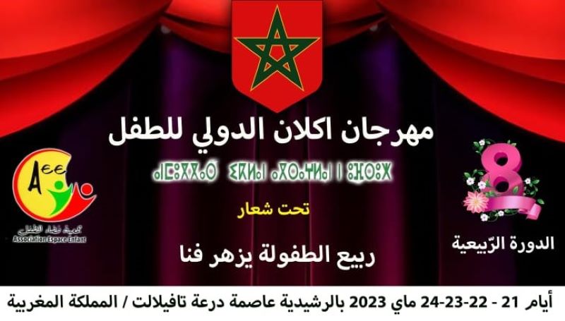 تنظم جمعية فضاء الطفل مهرجان إكلان الدولي للطفل والدورة الثامنة الربيعية بإقليم الرشيدية، عاصمة جهة درعة تافيلالت، خلال الفترة الممتدة من 21 ماي إلى 25 منه تحت شعار “ربيع الطفولة يزهر فنا”، وبتنسيق مع المديرية الجهوية لوزارة الشباب والثقافة والتواصل قطاع الشباب درعة تافيلالت.