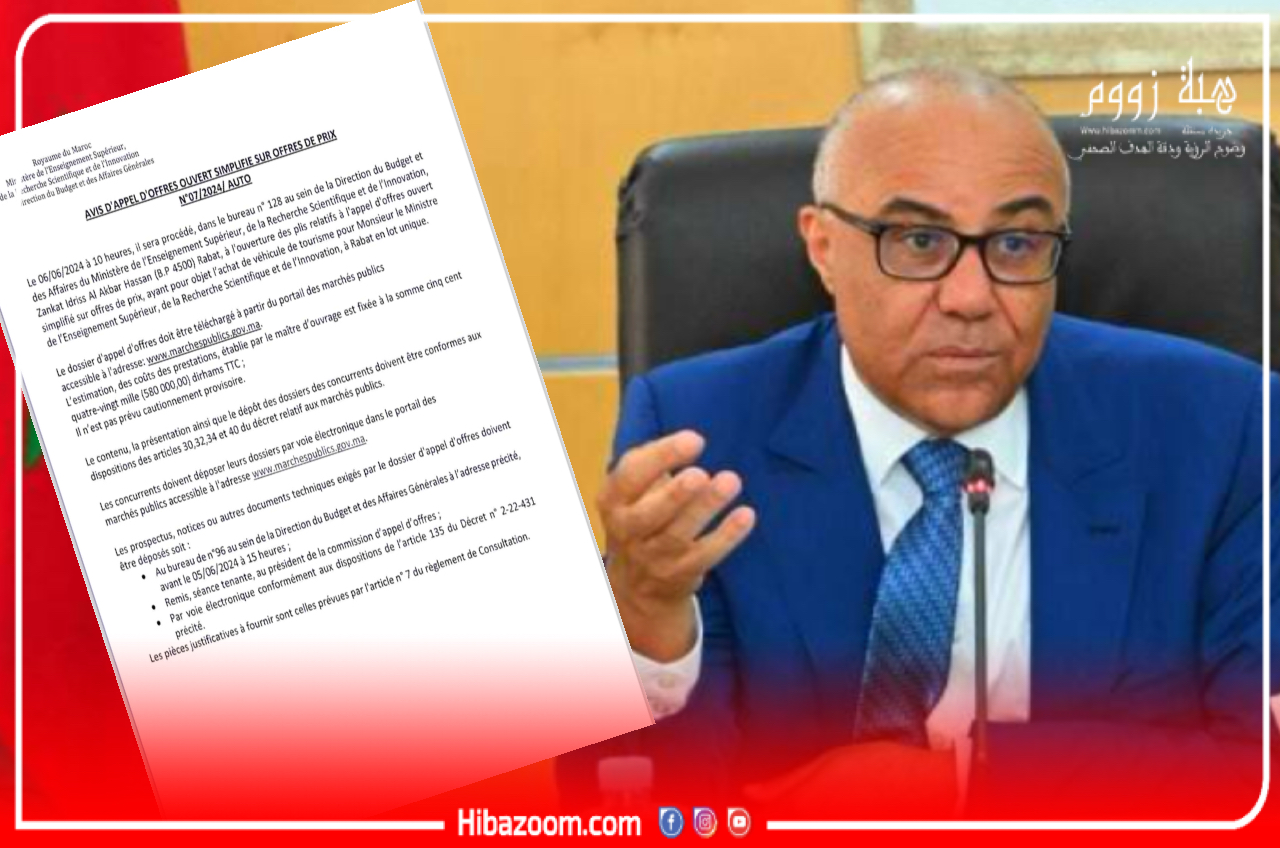 في ظل أزمة الطب التي تشهدها الجامعات العمومية والتي أسهم عبد اللطيف ميراوي، وزير التعليم العالي والبحث العلمي والإبتكار، في تأجيجها بتصريحات الوعد والوعيد في حق الطلبة، أقدم هذا الأخير، في ما اعتبره العديد استفزازا، على إطلاق طلب عروض عمومي تحت عدد 07/2024/AUTO من أجل اقتناء سيارة فارهة بكلفة 58 مليون سنتيم.
