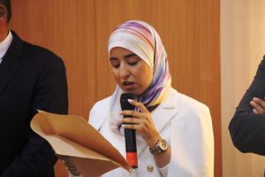 هاجر الصافي في كلمة بالمناسبة قدمت فيها بطاقة تقنية حول مسار الشراكة بين جماعة الحوزية ومؤسسة البنك الشعبي للتربية والثقافة برعاية مؤسسة محمد السادس لحماية البيئة والمراحل الثي قطعتها جماعة الحوزية للحصول على اللواء الأزرق، حيث انخرطت جماعة الجوزية في عملية شواطئ نظيفة تحت شعار المالية تبتسم” بتمثيلية شاطئها المركز، وذلك سنة 1999.