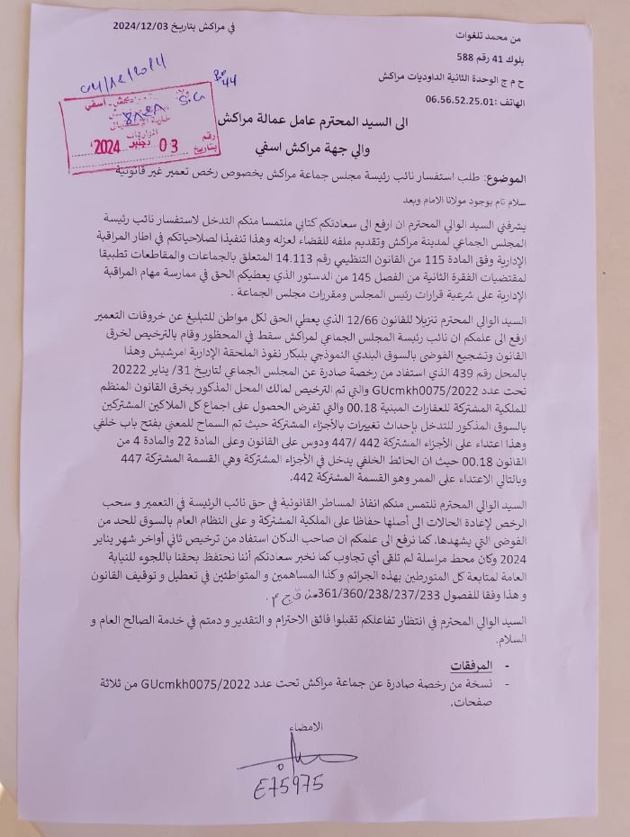 هذا، وقد أكد المواطن الشاكي، مراسلته الموجهة إلى والي الجهة، أن نائب الرئيسة قد سقط في المحظور وأصدر ترخيص بناء في السوق البلدي النموذجي بلبكار نفوذ الملحقة الإدارية امرشيش بالمحل رقم 439 دون الحصول على الموافقات اللازمة ودون احترام القوانين المنظمة للبناء في المناطق الحساسة.