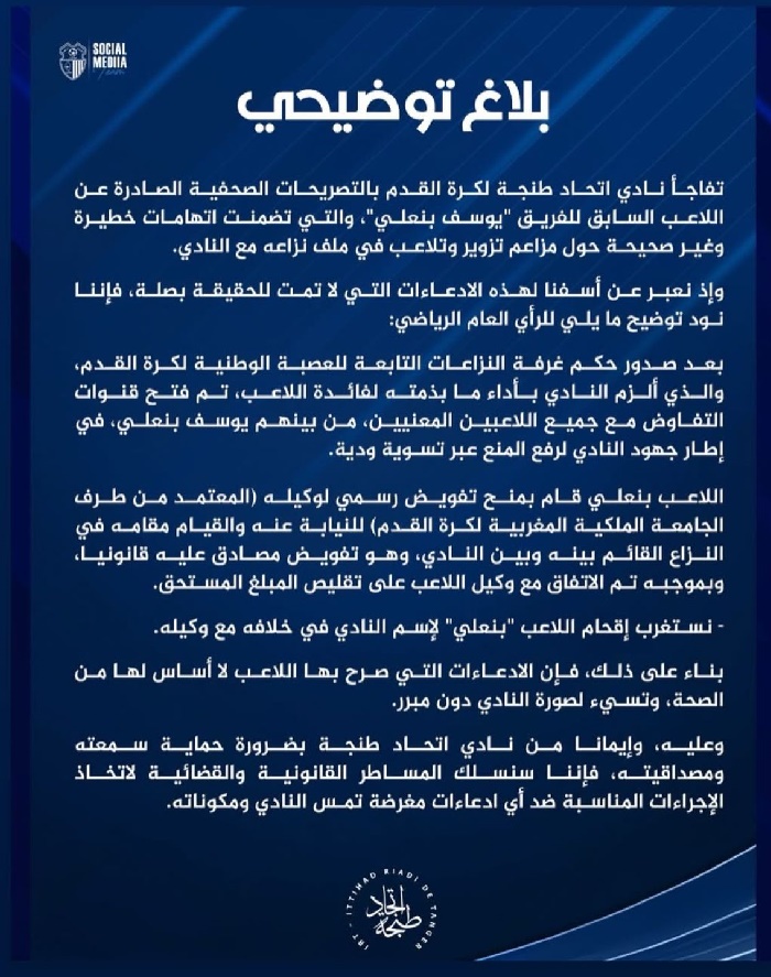 أصدر نادي اتحاد طنجة لكرة القدم بيانًا توضيحيًا للرد على التصريحات الصحفية الصادرة عن لاعبه السابق يوسف بنعلي، والتي تضمنت اتهامات خطيرة حول مزاعم بالتلاعب في ملف نزاعه مع الفريق.